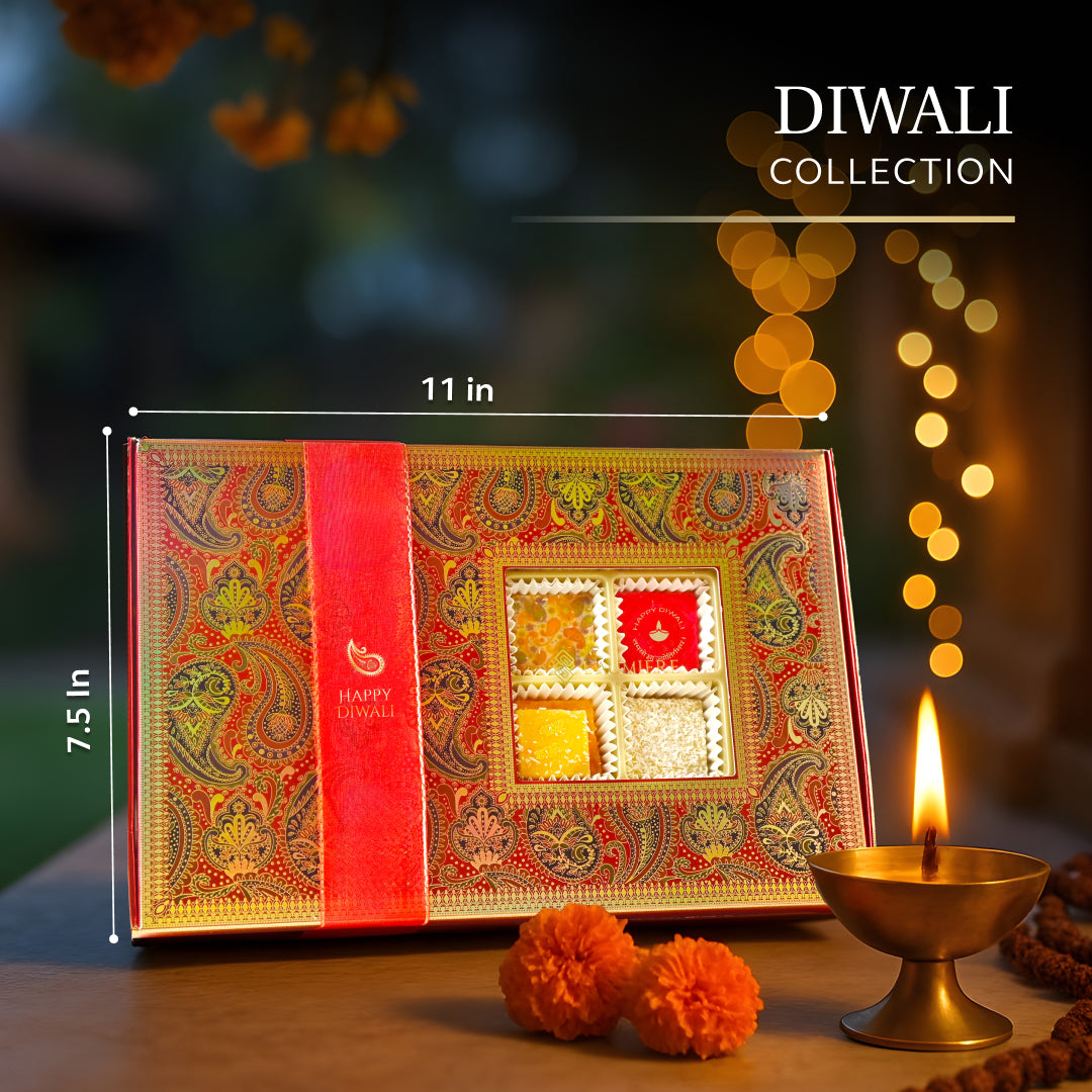 Epitomizing festive opulence, this magnificent Diwali gift box is a grand canvas of artistry crafted to honor the timeless spirit of the festival of lights. Within this collection are 24 exquisite treats, each one a luminous masterpiece, meticulously handcrafted from nature's finest ingredients. This is not merely a box of sweets; it is a full, curated journey of flavor, offering a sophisticated and wholesome experience that nourishes the body as it uplifts the spirit. A masterful expression of impeccable taste and heartfelt wishes, our premier collection is the ultimate Luxury Diwali gift to include in your festive celebrations.